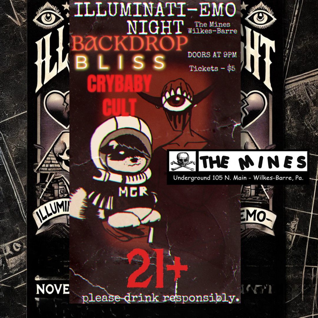 Get ready for an epic night of underground energy, intense music, and all the EMO feels at Mines Nightclub in Downtown Wilkes-Barre! 🎸 Featuring the hauntingly raw sounds of BLISS, BACKDROP, and CRYBABY CULT, this event promises to take the EMO scene to the next level. 🎤